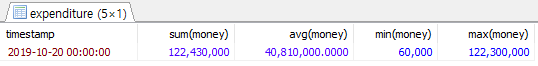 select timestamp,sum(money),avg(money),min(money),max(money) from expenditure group by timestamp;