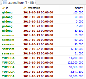 사용자별 지출내역이 들어있는 초간단 예시 테이블을 만들었습니다.