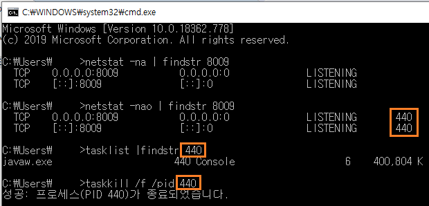 ※ 주의 : 리눅스는 윈도우랑 다르게 PID가 아닌 port로 명령어를 실행합니다.
