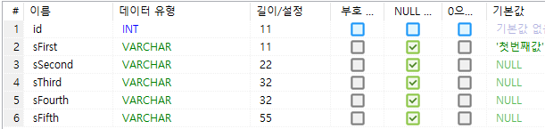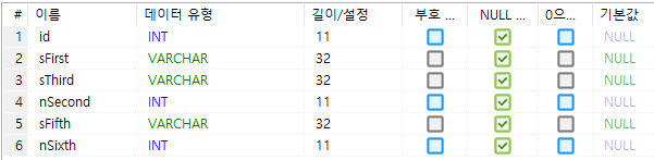nSixth 컬럼 INT(11) -> INT(6) , sFirst 컬럼 VARCHAR(32) -> VARCHAR(11)