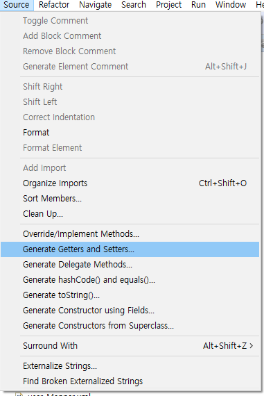 get/set 만들 클래스를 열은 상태에서 -> 이클립스에서 상단 메뉴 Source -> Generate and Setters... 클릭