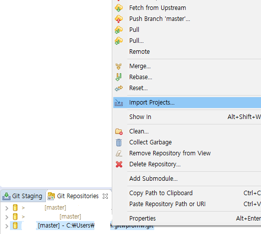 Local Git 선택 후 마우스 우클릭 -> Import Projects... 클릭