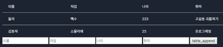 사용자가 input 창에 값을 넣고 table_append 버튼을 클릭 시 <tr><td> 입력 한 데이터가 한 줄씩 추가 된다.