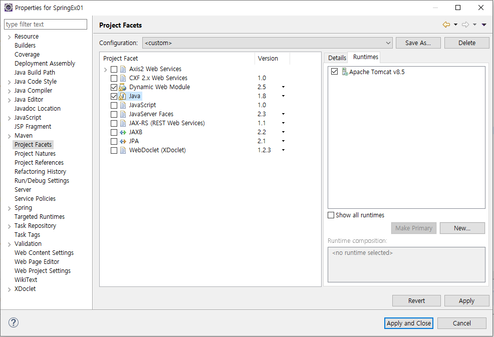 Project Facets 선택 -> Java 선택 -> 1.6 - 1.8로 변경 -> Runtimes 탭 클릭 -> Tomcat 체크 박스 체크 후